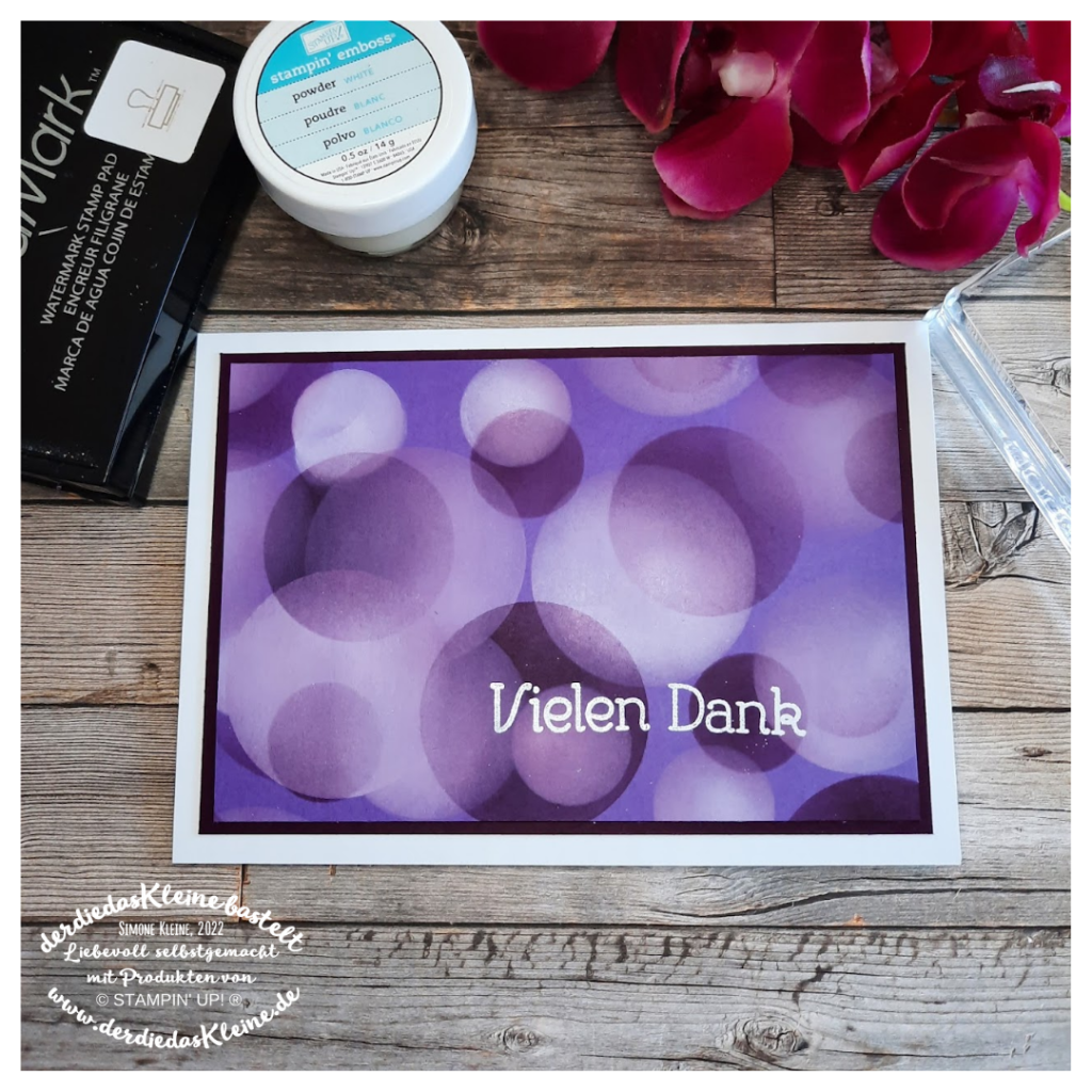 - Verwendet habe ich für meine Bokeh Dots Karte Cardstock in Grundweiß, Amethyst und Brombeermousse.