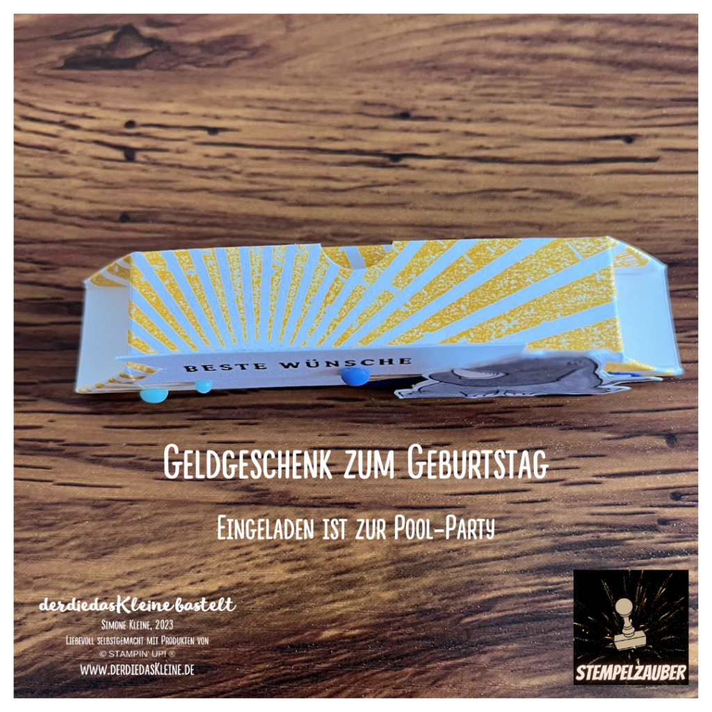 Mit dem tollen Hintergrundstempel „Rays of Light“ habe ich den Farbkarton für die kleine Box ohne zu Kleben in Osterglocke bestempelt und das Ein-Nashorn vorne in eine Art kleinen Teich gesetzt. Der kleine Helfer ist zu einer Pool-Party eingeladen und es ist heute vergleichsweise zu den letzten Tagen heißer als sonst hier in Paderborn.