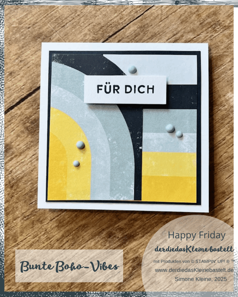 Und weil ich diese Reihe „Bunte Boho-Vibes“ aktuell echt feiere, habe ich mich wieder für das bezaubernde Designerpapier, die gedeckten Schmucksteine und das Stempelset daraus entschieden. Du wirst also noch mehr Boho hier sehen und kannst gespannt sein. Mein zweiter Favorit wird hier demnächst noch mal genauer unter die Lupe genommen.
