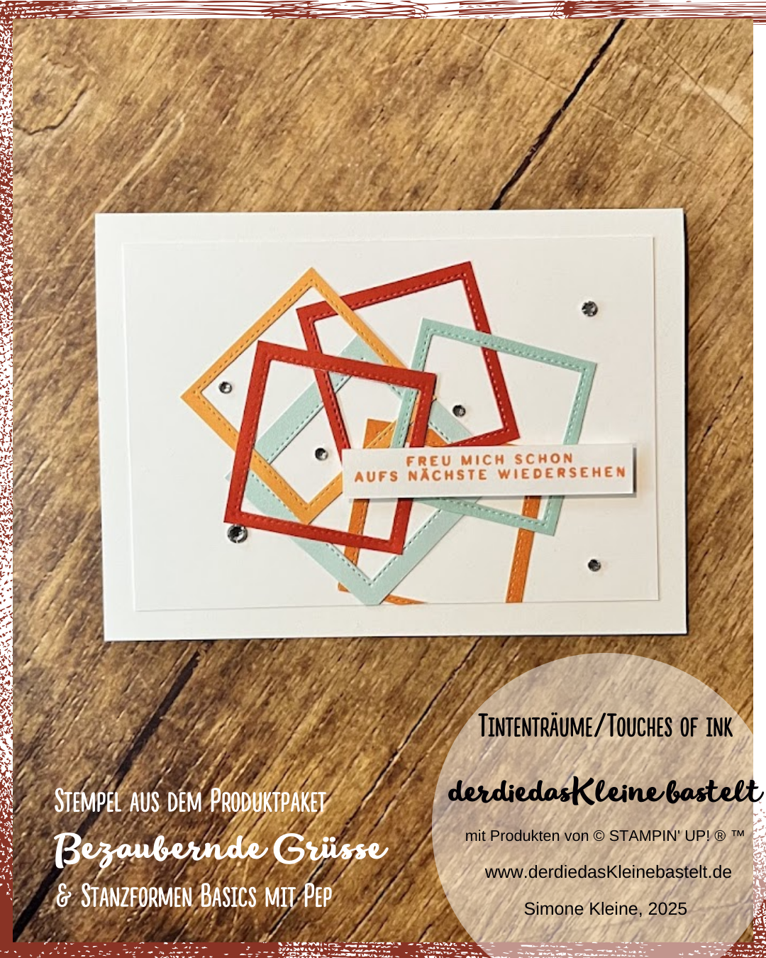 Heute zeige ich dir eine Karte mit einem Wiedersehen einer bestimmten Farbkombination und mit einem Stempel aus dem Produktpaket „Bezaubernde Grüße“. Das Besondere, die Karte kommt ganz ohne die Blumen aus dem Produktpaket aus.
